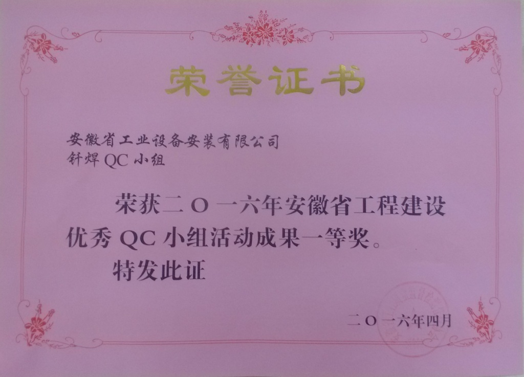 近日,安徽省工程建設優秀QC小組活動成果交流會在肥順利舉行。本次活動以“萬眾創新、扎實推進、分享提升”為主題,由安徽省工程質量監督檢測管理協會主辦,安徽建工集團有限公司協辦,來自全省建筑業企業的235支QC小組成員競技一堂。會上,安徽安裝公司質量管理小組題為“提高冷庫制冷系統銅管釬焊的一次合格率”的成果獲得了全省一等獎的好成績。